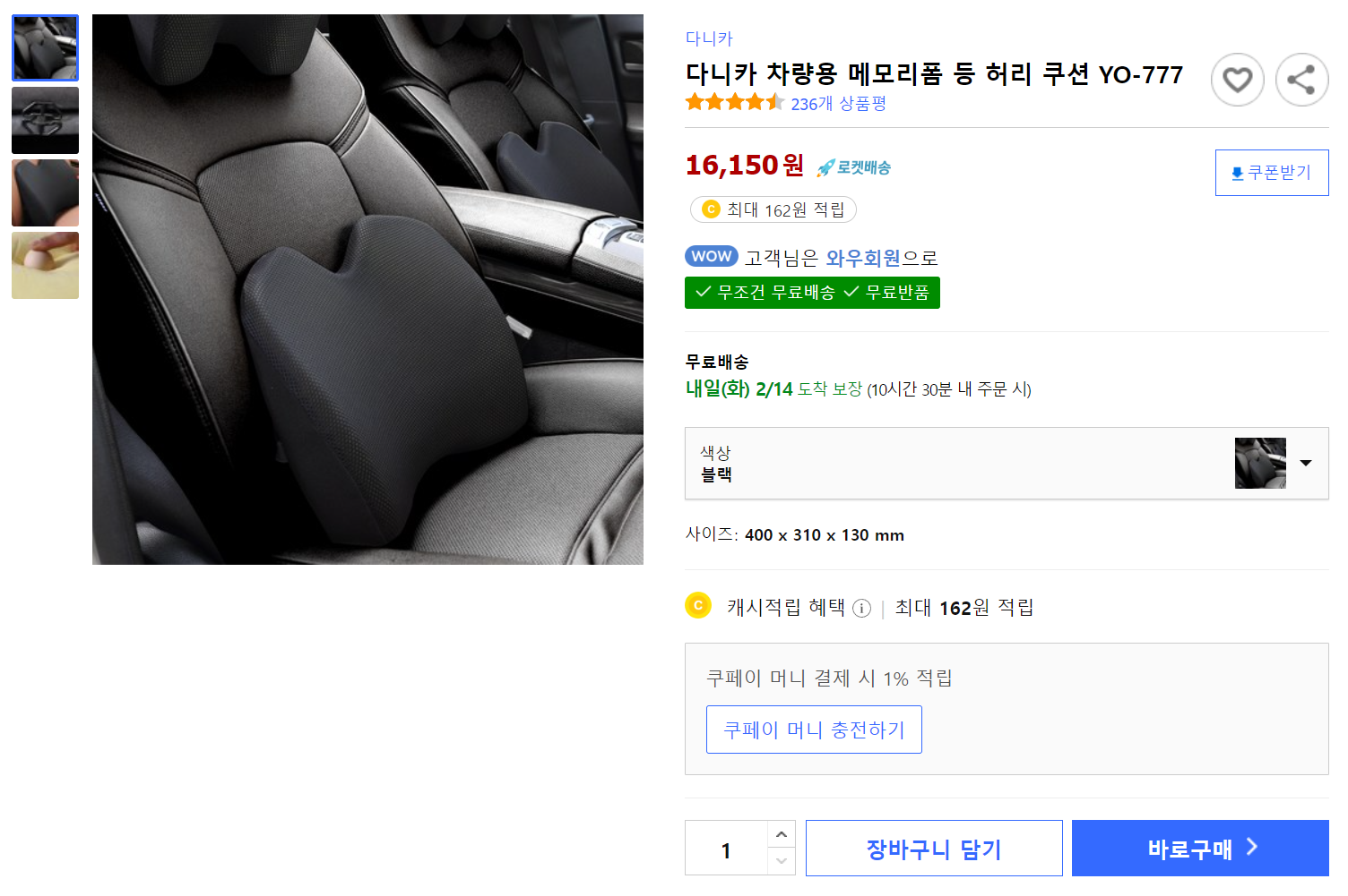 다음 차는 무조건 현대나 일본 차로 넘어가야지라는 다짐을 하며, 자동차 등받이 쿠션을 쿠팡에서 검색했습니다.