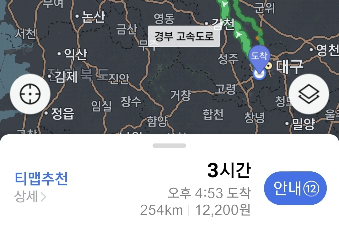 용인에서 대구까지의 거리는 258km, 중간중간 휴게소에 들르는 시간까지 합하면 4시간 정도 걸렸습니다.