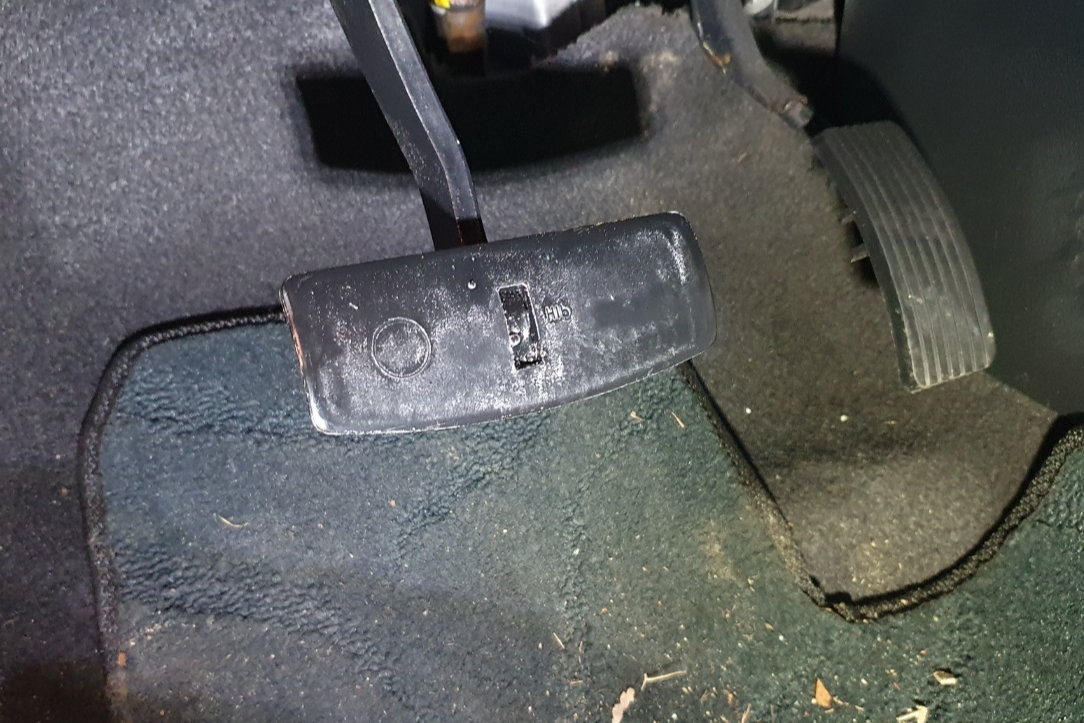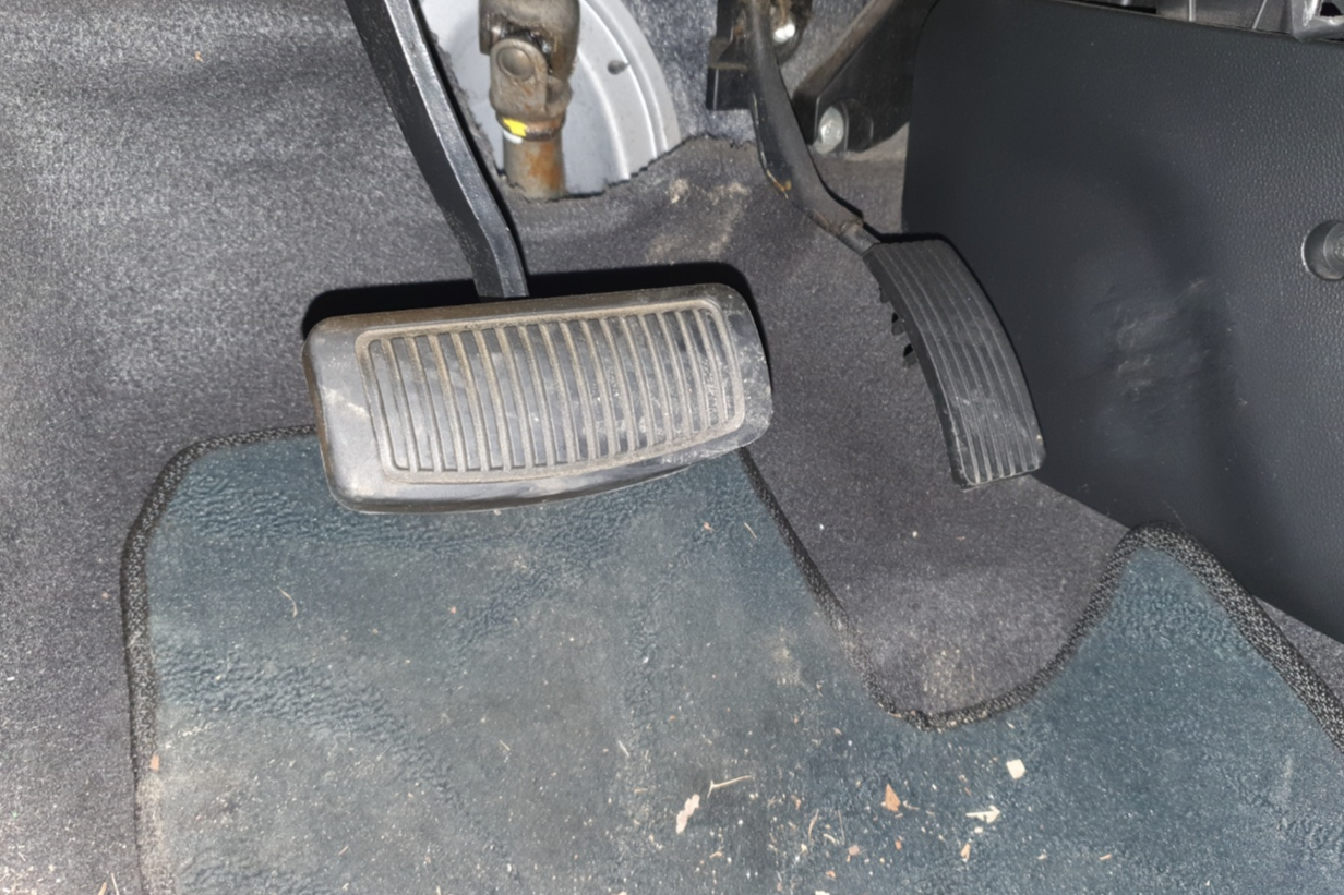 고무패드를 벗겨낸 뒤 모습을 드러낸 브레이크 페달의 민낯입니다.