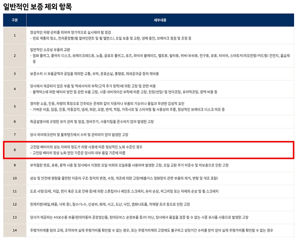 위에서 보여드린 현대자동차의 보증기간 표를 보면, 일부 구형 차종을 제외한 주요 하이브리드 차종들은 고전압배터리 평생보증이 모두 빠져있고 엔진과 같이 취급하여 10년/20만km입니다. 하지만 여기서 함정은, 현대자동차의 보증 제외 항목 8항입니다.